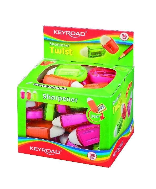 - 1 lyukú műanyag hegyező. 2 in 1 kifordítható hegyezővel és radírral. 3 féle színben.