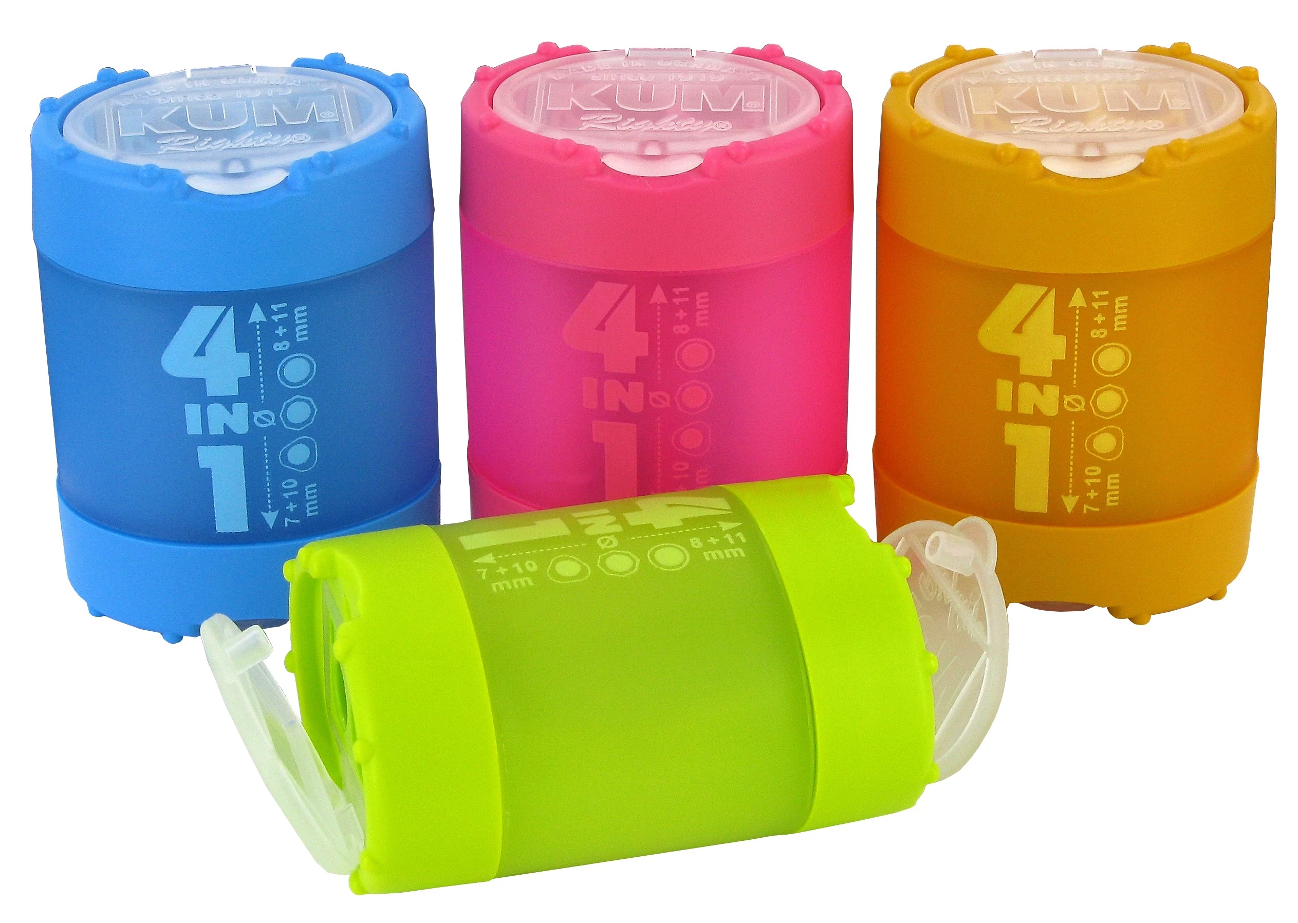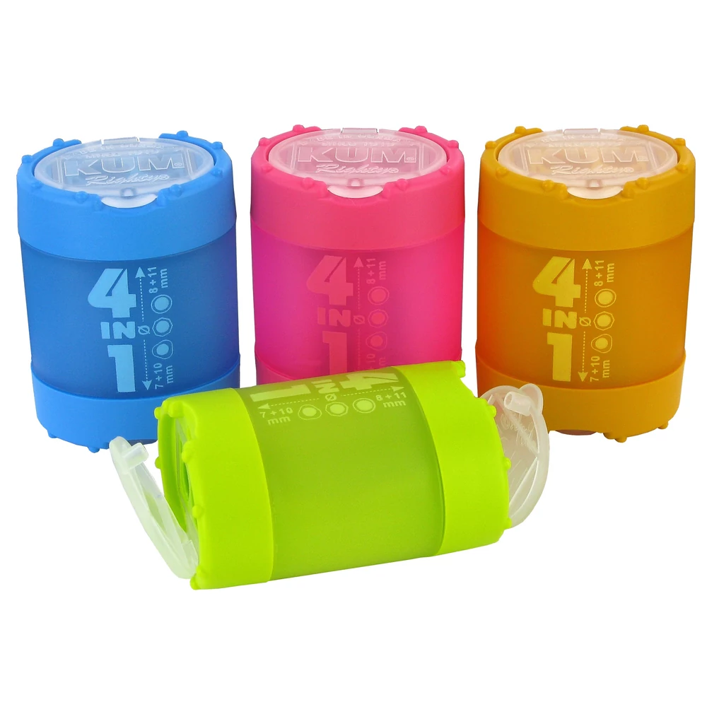 - 4 az 1-ben 4 lyukú, tartályos hegyező, 7-11 mm-ig terjedő átmérőjű, hatszögletű, háromszögletű és hengeres testű ceruzák hegyezésére (7mm+10mm és 8mm+11 mm)