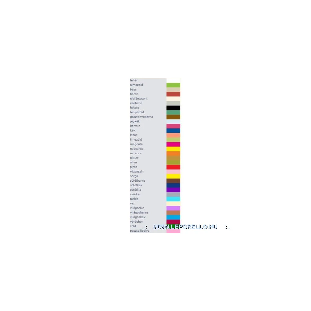 SZINEK: 007101-kármin , 007102-sárga ,007103-középkék ,007104-fehér , 007105-fekete , 007111-bézs , 007113-narancs , 007114-rózsa ,007115-piros, 007116-vkék, 007117-sötétkék , 007118-világoslila , 007119-sötétlila , 007120-almazöld ,007121-limezöld , 007122-fenyőzöld , 007123-középzöld ,007124-világos barna ,007125-bordó, 007129-tejeskávé , 00 7130-lazac , 007131-oliva , 007132-vörösbor , 007133-türkiz , 007134-esőfelhő , 007136-okker , 007137-gesztenye, 007138-jégkék , 007139-pasztelibolya ,007140-magenta, 2162/007139-pasztellibolya, 2174/007126-sötétbarna, 13362/007332-mályva, 2123/007132-vörösbor, 2125/007133-türkiz, 13365-púderszín, 2163-tejeskávé, 13363/007333-padlizsán