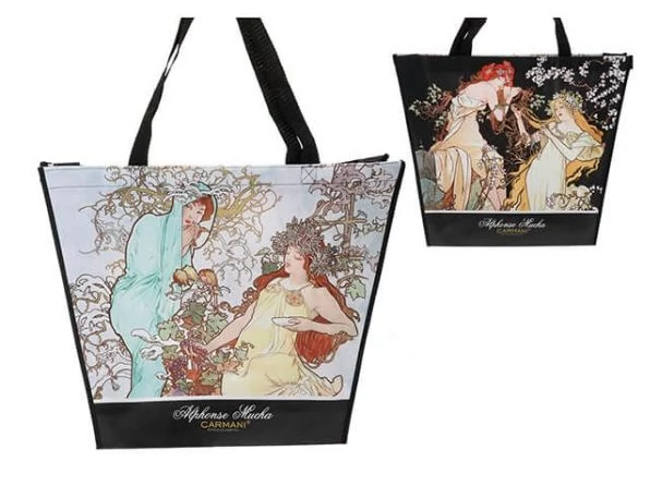 Műanyag táska, melynek mindegyik oldalát egy-egy Mucha festmény díszít. A vállraakasztható táska mérete: 46x11x38 cm.