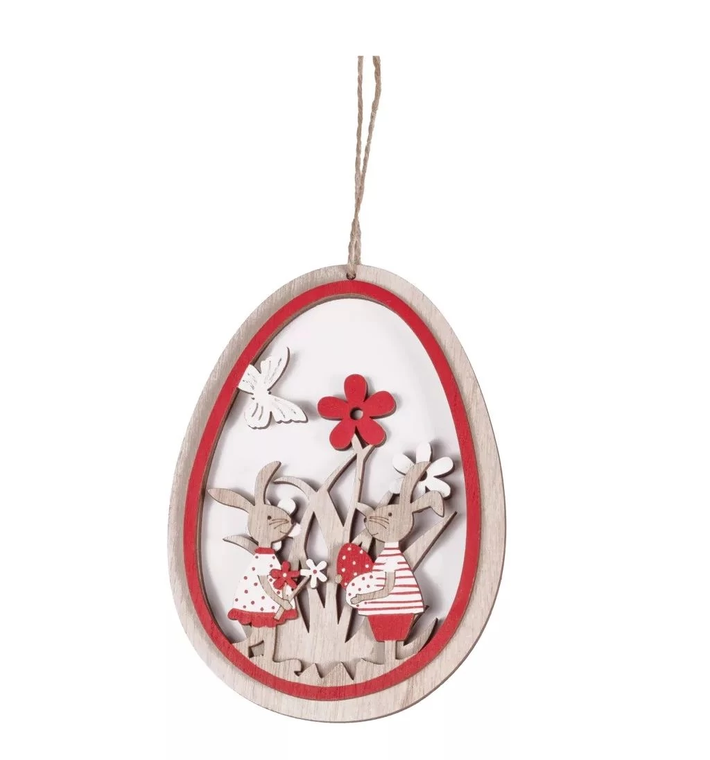 FA AKASZTÓ TOJÁSBAN NYULAK, VIRÁGGAL, PIROS ÉS FEHÉR MINTÁS