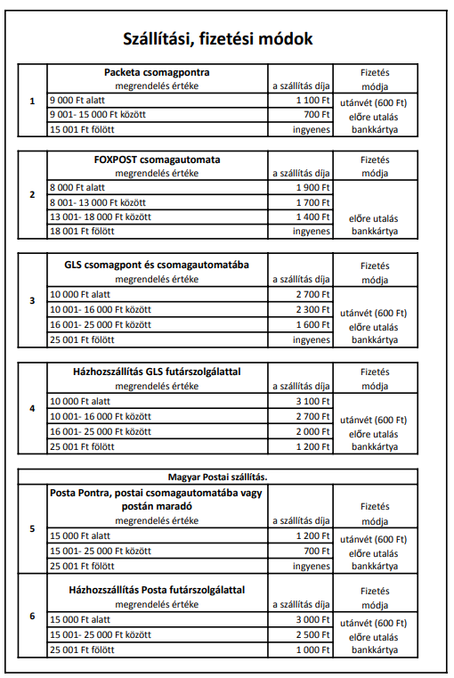 Szállítás feltételei és díjai: Az értékek bruttó rendelési értékre vonatkoznak.