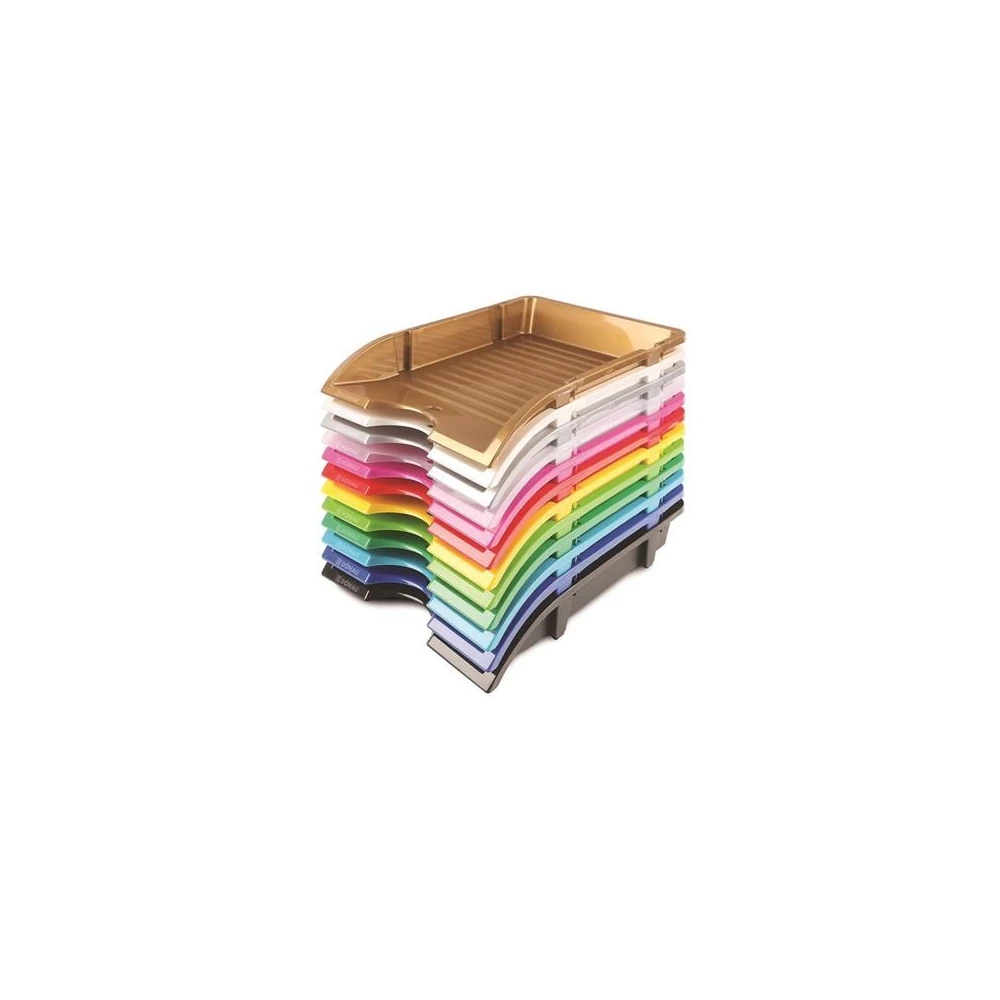 Színek: D745AR-arany, D745FE-fehér, D745E-ezüst, D745F-fekete, D745GY-gyöngyház, D745K-kék, D745P-piros, D745R-rózsaszín, D745S-sárga, D745T-türkíz, D745VZ-világoszöld - törésálló PP anyagból készült - a tálcák kialakítása lehetővé teszi, hogy több elemet is egymásra helyezzünk - szállításnál és tárolásnál biztonságosan és helytakarékosan egymásba helyezhetők - bordázott felület a tálca alján - A4 méretű iratok, katalógusok tárolására - mind irodai, mind otthoni használatra kiváló - 12 különböző színben elérhető - méret: 250x345x45mm - kiszerelés: 1 db