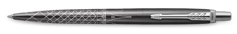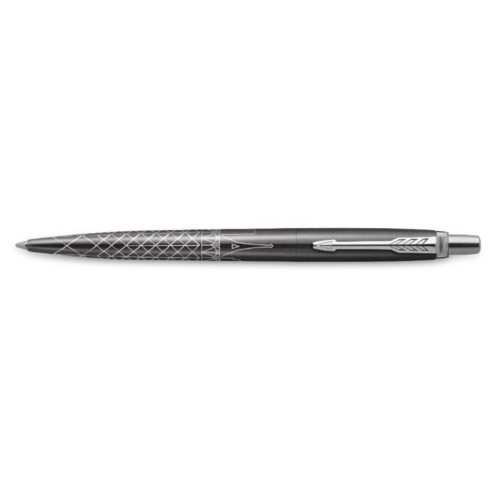 A Parker mesteri kivitelezésének lenyűgöző példájaként az egyedi dizájn precízen lézergravírozva jelenik meg a toll testén. A szürke lakkozott felület, a sima írásélmény és a Jotterre jellemző ikonikus „kattanás” teszi teljessé ezt az elegáns tollat.