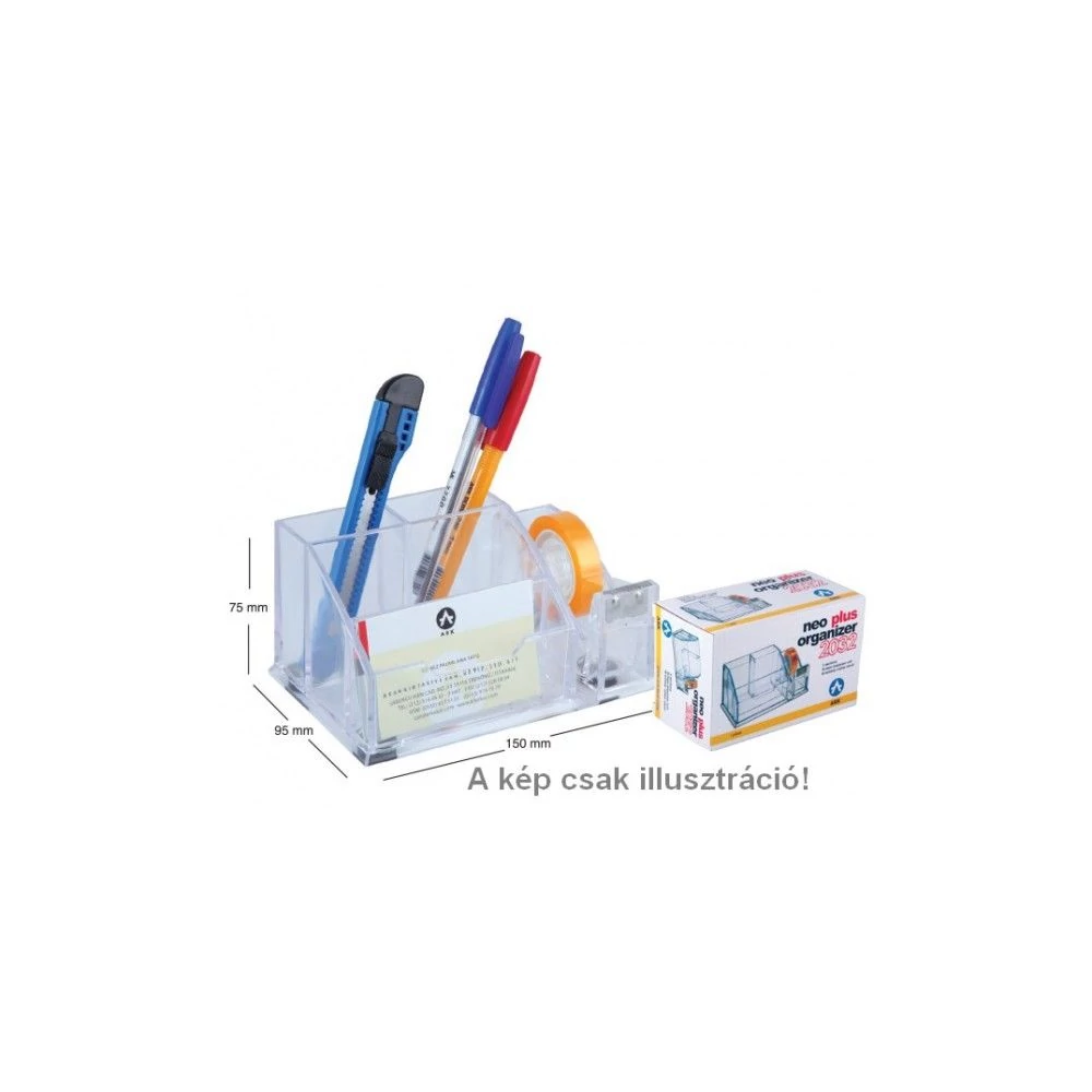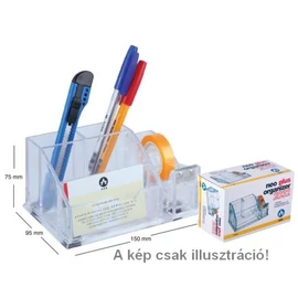 - 4 rekeszes műanyag asztali írószertartó beépített névjegykártyatartóval, és celltépővel. - Mérete: 150 x 95 x 75 mm.