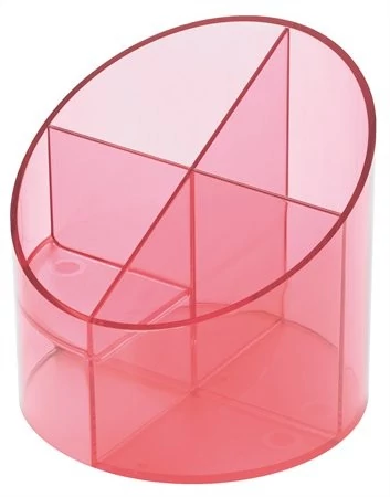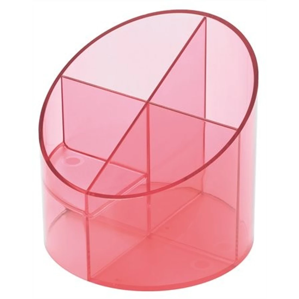 SZINEK: INH6390208-füst, INH6390202 víztiszta , INH6390220-áttetsző piros, INH6390230-áttetsző kék - asztali írószertartó - 4 rekeszes - friss színek, fényes, átlátszó anyag - átmérő: 110 mm - magasság: 105 mm - tartozékok nélkül