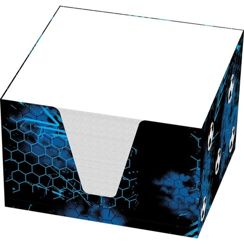 Tépőtömb fehér papírból, mintás papírdobozban. Információk, üzenetek gyors rögzítésére. Méret: 9 x 9 x 6 cm