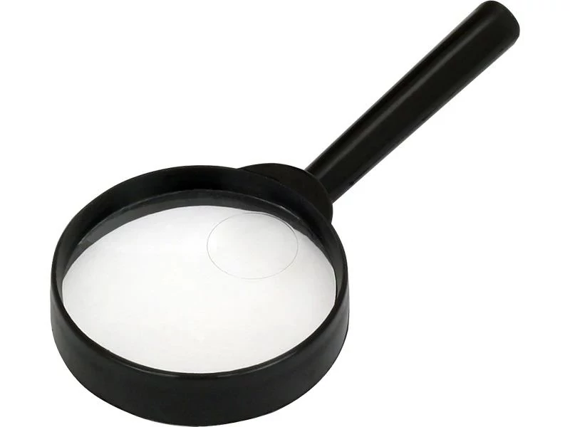 Műanyag keretes kézi nagyító, 5-szörös nagyítás. Fogantyús, torzításmentes üveg, átmérő: 50 mm