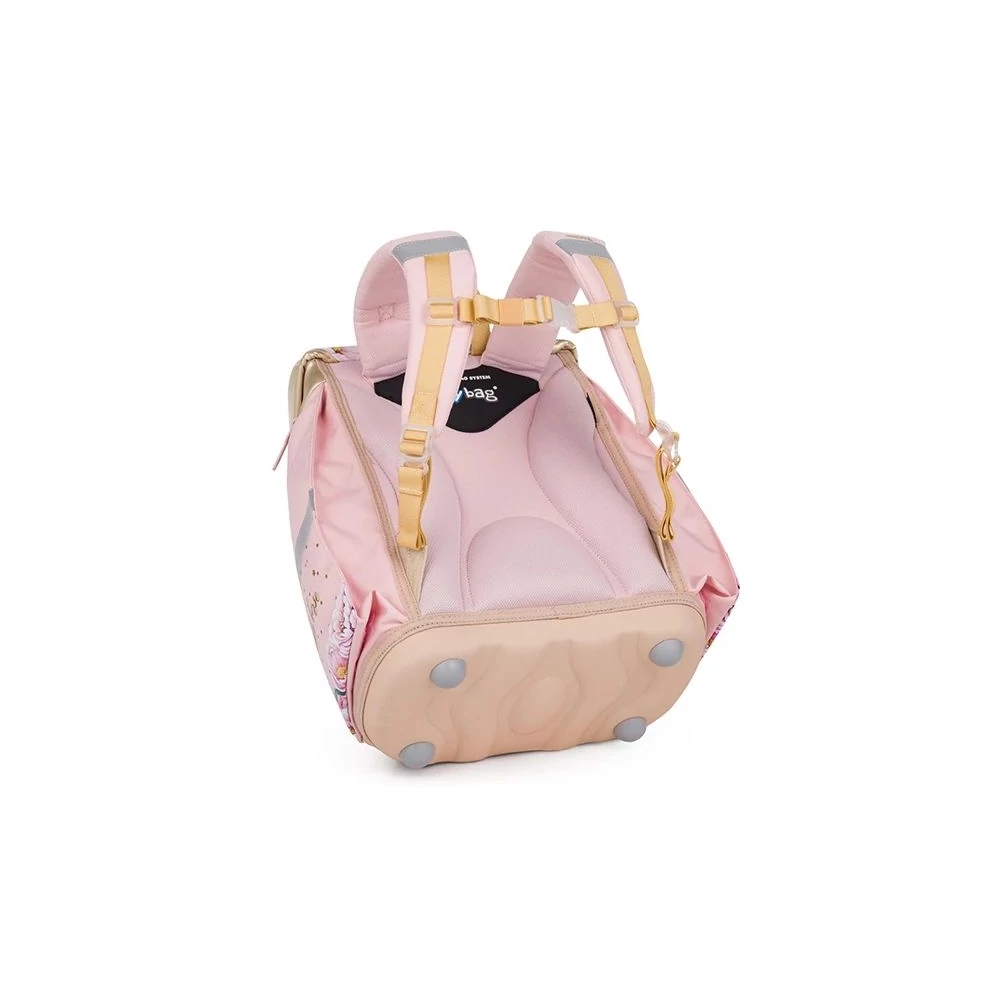 A barátságos iskolatáskába első látásra beleszeret: anatómiailag formázott és párnázott háttal, állítható pántokkal (váll és mellkas) rendelkezik, a belső megerősítésnek köszönhetően pedig tökéletesen tartja formáját. A szilárd lábakkal ellátott alap megakadályozza, hogy a külső rész szennyeződjön, és a belsejében kiömlött anyagok kiszivárogjanak. Elöl egy praktikus uzsonnazseb, oldalt pedig két nagyobb zseb található. Értékelni fogja a biztonságos záródást biztosító csatot és a fényvisszaverő elemeket is.