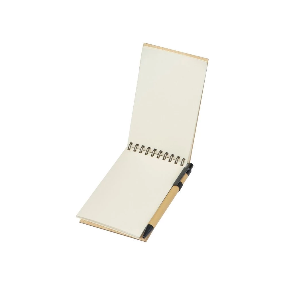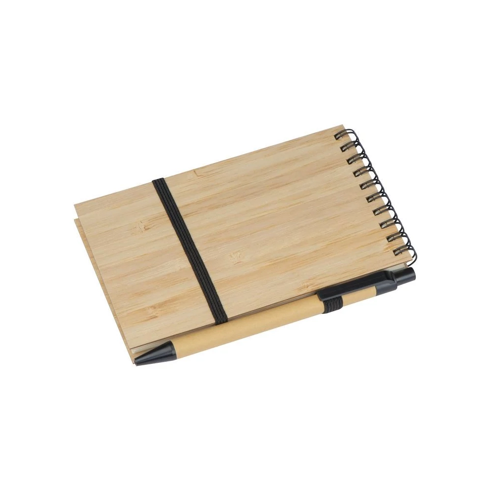 Bambusz notesz 140 üres oldallal, spirálkötéssel, tollhurokkal, golyóstollal és gumipánttal.