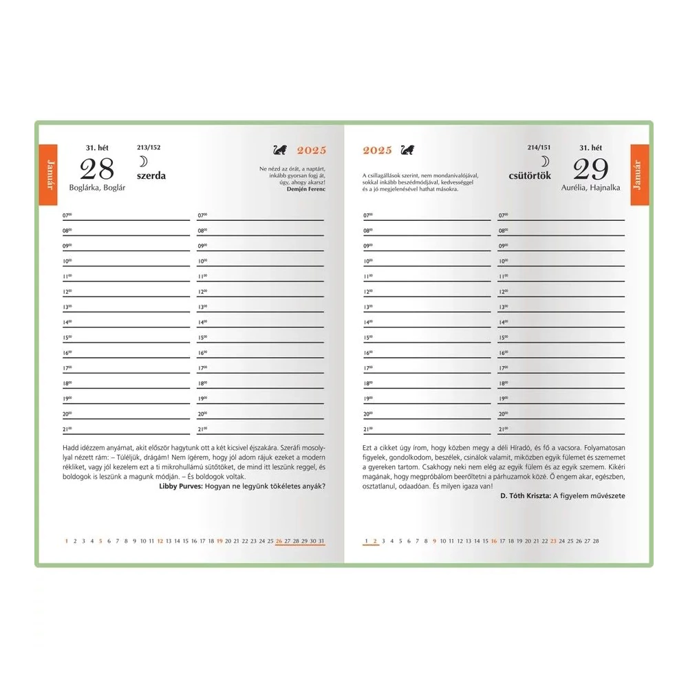Napi beosztású kalendáirum, 400 oldalas. Extrák: jelzőszalag, sarokperforálás.
