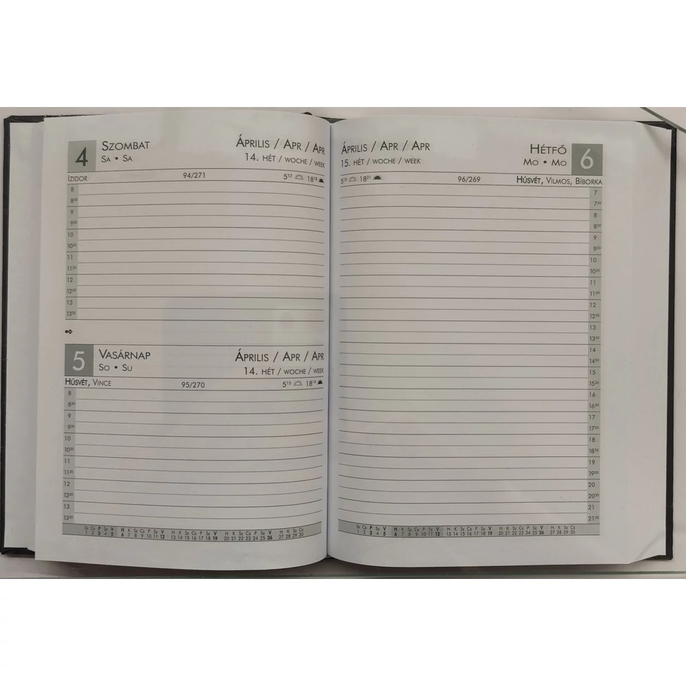 Napi beosztás, fehér papíron egy színnel nyomva, 14 oldal szakszöveg, 368 oldal napló, 18 oldal ábécémutató, műbőr keménytábla, évszámnyomással.