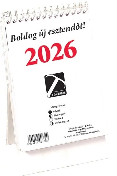 97x138 mm, 70 g-os ofszet, spirálozott lapok. Naptárrész: holdfázisok, magyar névnap és ünnepnap kiemelés, napkelte/napnyugta. 54 lapos terjedelem. A hátlap nem tartozék.