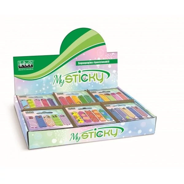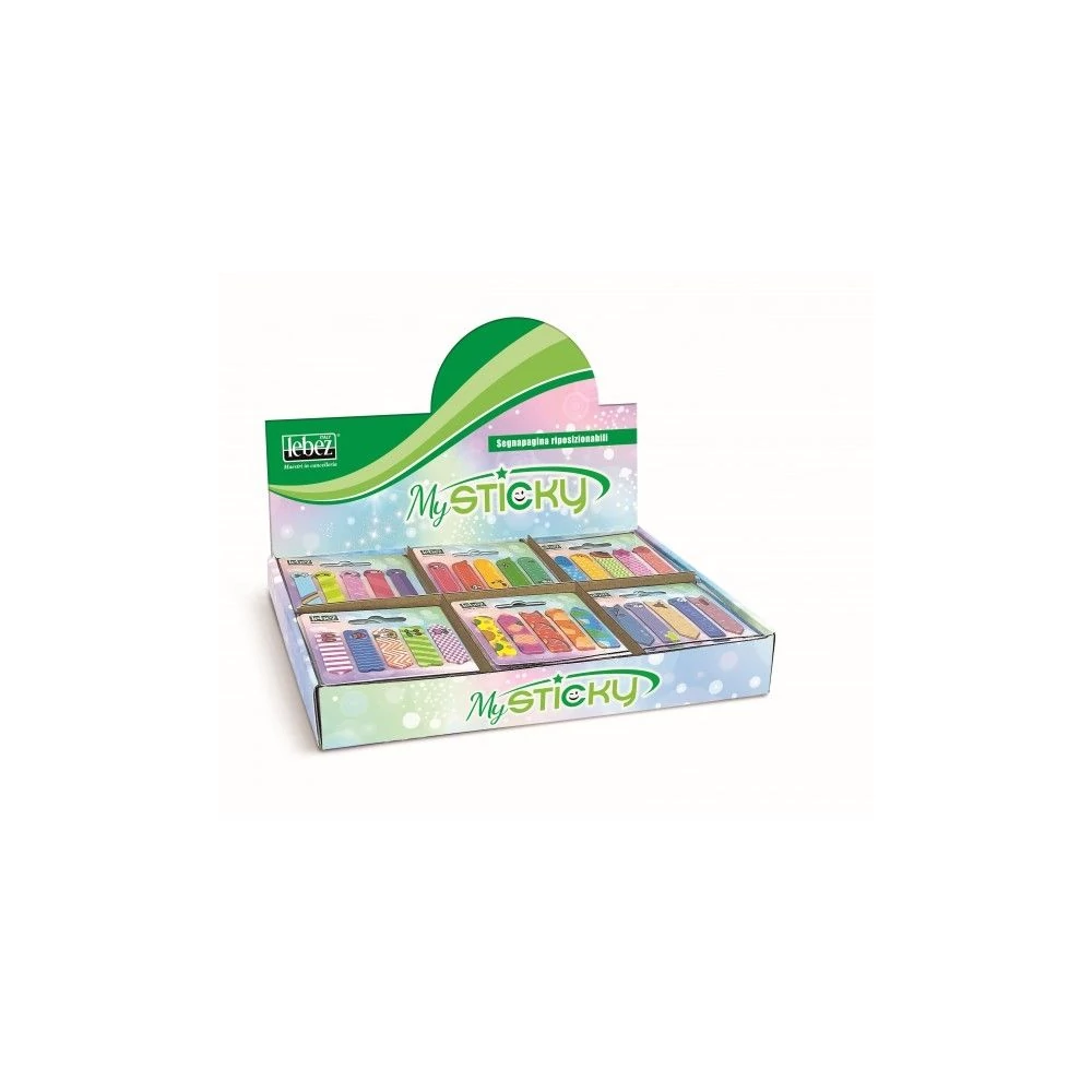 Műanyag, öntapadós, visszaszedhető jelölő cimke féle mintával, könyvek, dokumentumok oldalainak megjelölésére. Egy tömb tartalma: 5 x 25 lap. Egy cimke mérete: 12 x 45 mm.