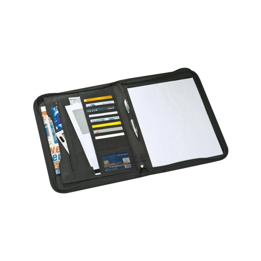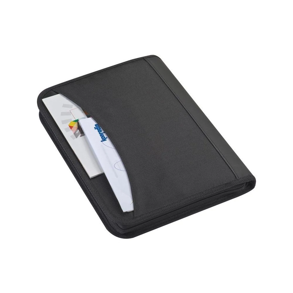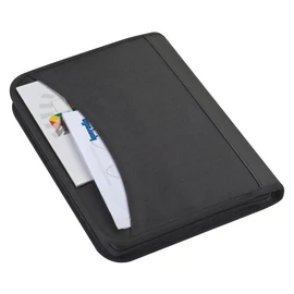 - Fekete színű, nylon konferencia mappa, sima és cipzáras kialakítású belső rekesszel, névjegytartókkal, A4-es jegyzettömbbel.