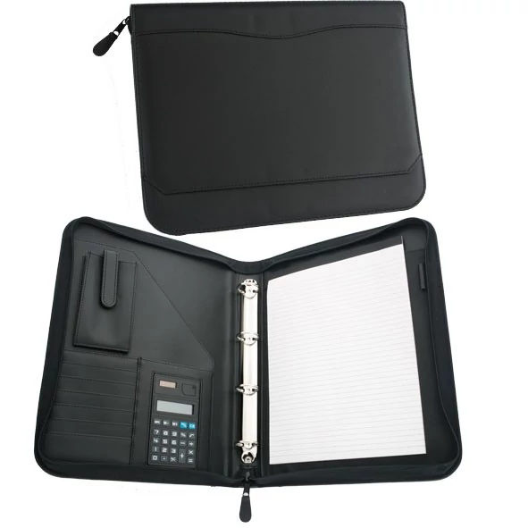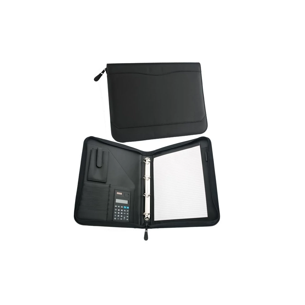 -A4 méretü ,fekete , műbőr portfólió,-zippes -4 gyűrűs -kivül belül zsebek -mobiltartó - mappabetét -számológép.