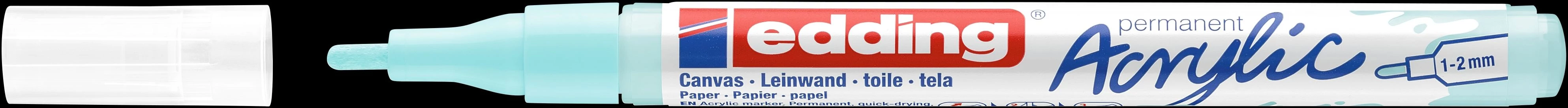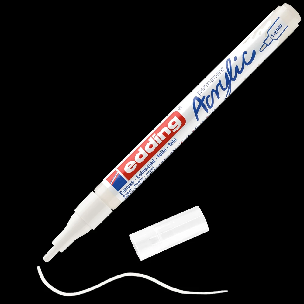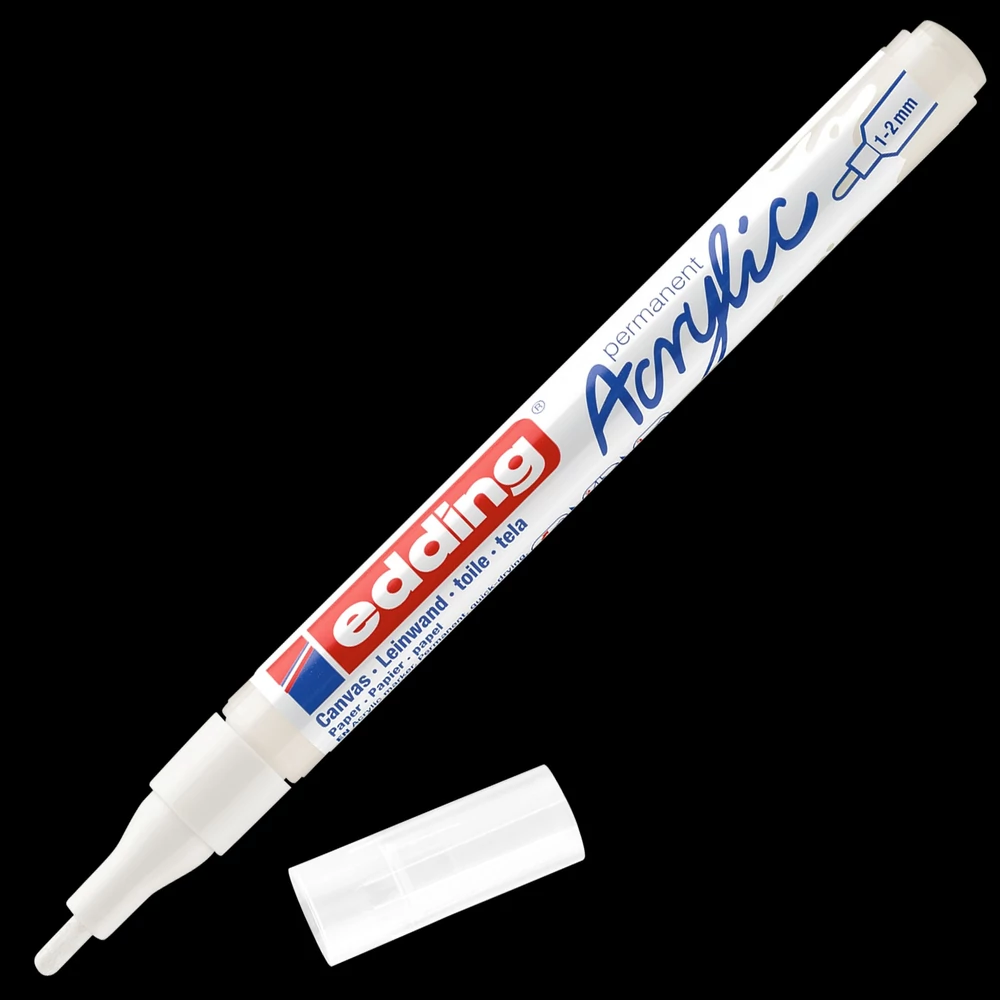 Színek: 7580246013-traffic white(922), 7580246019-classy mauve(935), 7580246008-sunny yellow(906), 7580246000-neon yellow(065), 7580246009-berry(910), 7580246002-neon pink(069), 7580246005-traffic red(902), 7580246001-neon orange(066), 7580246007-traffic yellow(905), 7580246010-pastel blue(916), 7580246006-gentian blue(903), 7580246011-pastel green(917), 7580246003-warm beige(255), 7580246017-yellow green(927), 7580246018-opulent turquoise(934), 7580246012-hazel(919), 7580246016-anthracite(926), 7580246004-black(901), 7580246014-silver(923), 7580246015-rich gold(924).Akril marker világos vagy sötét felületekre történő festéshez, ideális olyan anyagokhoz, mint a vászon vagy a festőpapír. - A kerekített csúcs vonalvastagsága 1-2 mm. - A kiváló minőségű, pigmentált, vízbázisú akrilfesték száradás után rendkívül tartós, átlátszatlan, fényálló és szagtalan. - A közlekedési fehér szín félig áttetsző. Megfelelő pótcsúcsok (edding 5300 pótcsúcsok) elérhetők.- 20 féle színválasztékban elérhet