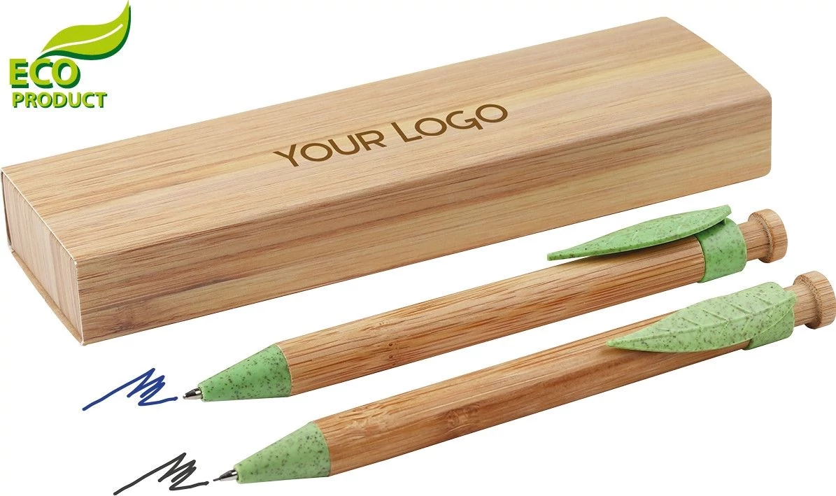 Bambusz golyóstoll és ceruza készlet búzaszalma klippel, papírdobozban, környezetbarát termék
