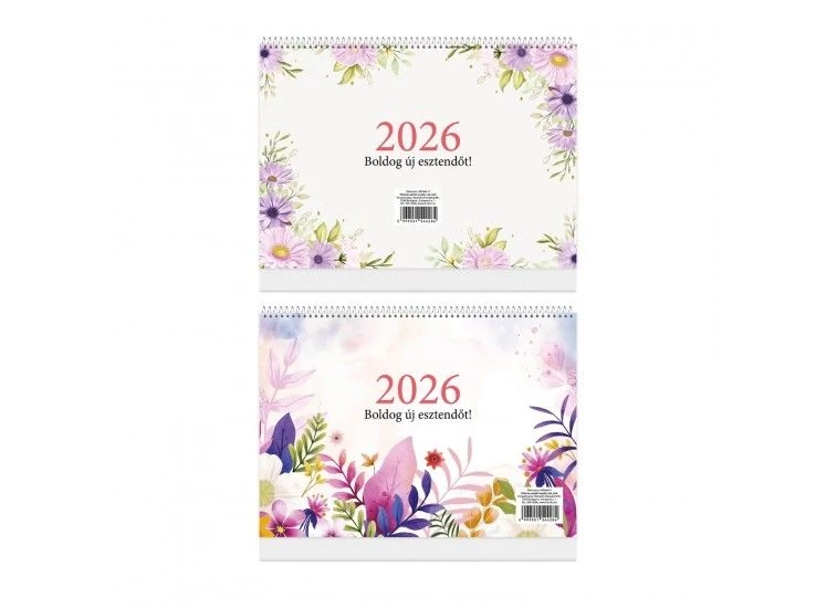 2026. évi A/4 méretű asztali naptár háttal összeszerelve, 1 lapon 1 hét, a napoknál félórás beosztással, csillagászati adatok a belíven, a nap kel és nyugszik időpontok mellett a hold kel és nyugszik időpontok is megjelennek, de szerepelnek a csillagövi jelek is. 70 gramm fehér ofszet belív, 150 gramm műnyomó borító, erős karton naptárháttal, fehér spiráldróttal, két mintával. Minta a készlet erejéig választható.
