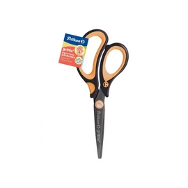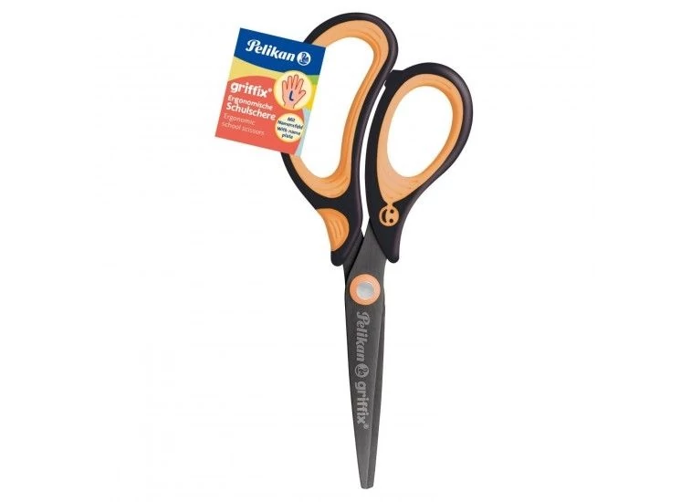 Griffix iskolai olló, 15 cm, hegyes, ergonomikus fogófelülettel, balkezeseknek, az acélnál 3x keményebb titánnitrid-bevonattal, névcímkével, mosolygós figura segíti a gyerekek számára a helyes kézben tartást, Neon Black színben, 25 év garanciával