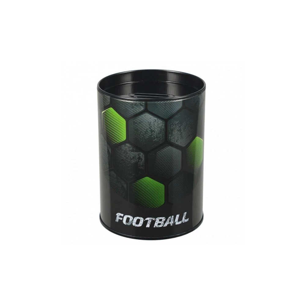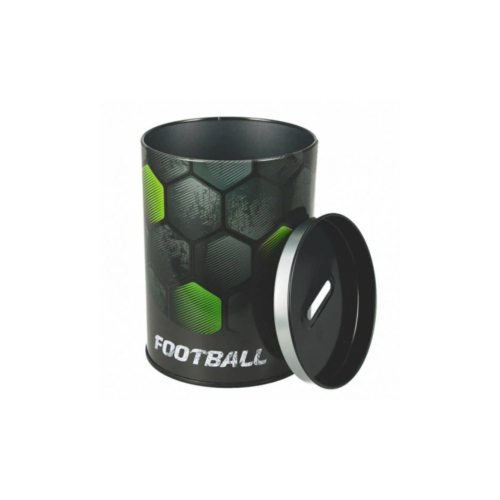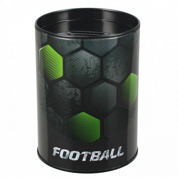 Focilabdás mintájú persely, melyben a zsebpénz gyűjthető. A fémpersely teteje levehető.