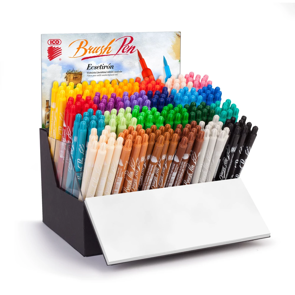 - Ecset jellegű, hajlékony írócsúccsal ellátott rostirón, rajzolásra, nagyobb felületek színezésére. 24 féle élénk színben. SZINEK: CITROMSÁRGA(20),SÁRGA(24)NARANCS(27) RÓZSASZÍN(11) VILÁGOS PIROS(23) PIROS(10) CIKLÁMEN(63) LILA(60) TÜRKIZKÉK(52) VILÁGOSKÉK(51) KÉK(50) SÖTÉTKÉK(53) TÜRKIZ ZÖLD(44) VILÁGOSZÖLD(41) ZÖLD(40) SÖTÉTZÖLD(42) SÁRGÁS-ZÖLD(48) DRAPP(04) BARACKVIRÁG(05) SZÜRKE(73) VILÁGOS BARNA(33) BARNA(31) SÖTÉTBARNA(30) FEKETE(70)
