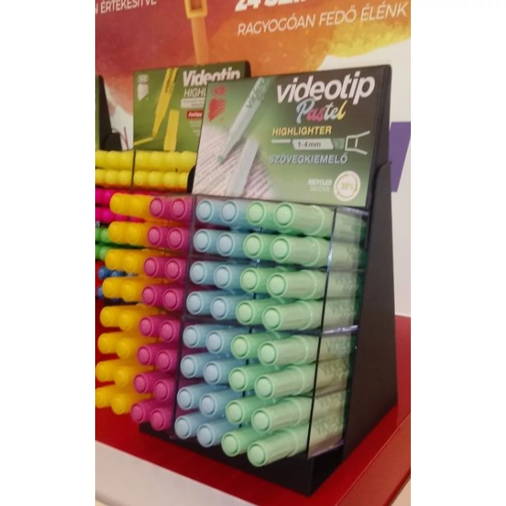 - Speciális pasztell színű festékkel töltött szövegkiemelő. A kiemelt szöveg fénymásolható, faxolható. Vágott csúccsal, 4 féle élénk színben. Vonalvastagság: 1-4 mm.