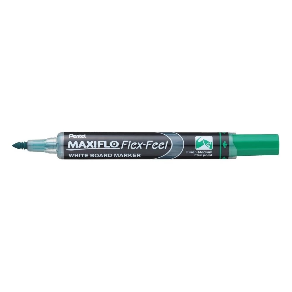 MWL5SBFAX-fekete, MWL5SBFBX-piros, MWL5SBFDX-zöld, MWL5SBFCX-kék A Pentel Maxiflo Flex Feel táblafilc egy egyedülálló újdonság. Különlegessége a rugalmas kúpos hegy, mellye tetszés szerint variálható az írásvonal vastagsága 1mm és 5mm között. HASZNÁLJA AKÁR KALLIGRAFIKUS ÍRÁSRA! A Pentel Maxiflo táblafilc pumpás megoldásával kivédheti a gravitáció hatását, akár fejjel lefelé is írhat. Csak nyomja meg a marker végében található gombot és írjon háromszor tovább, mint egy átlagos táblafilccel. Messziről is jól látható, 3 életteli színben kapható. 50%-ban újrahasznosított anyagokból készült. tinta ablakos, pumpás adagolórendszerrel, melynek köszönhetően a teljes tinta mennyiség kiírható a markerből.