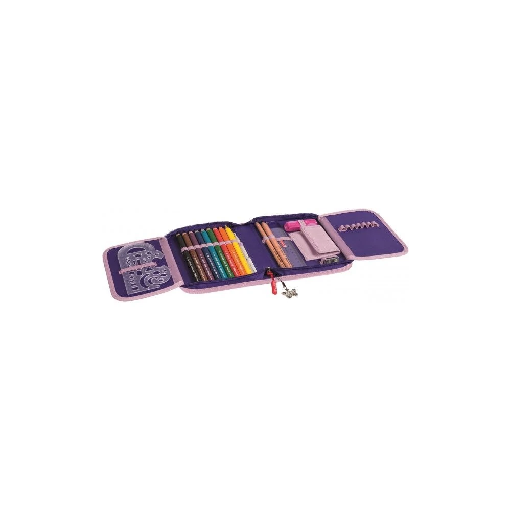 2 klapnis töltött tolltartó. Méret: 19,5 x 13,5 x 3,5. Tartalma: 9 db színes ceruza, 1 db 16cm vonalzó, 1 db radír, 1 db 2 lyukú hegyező.