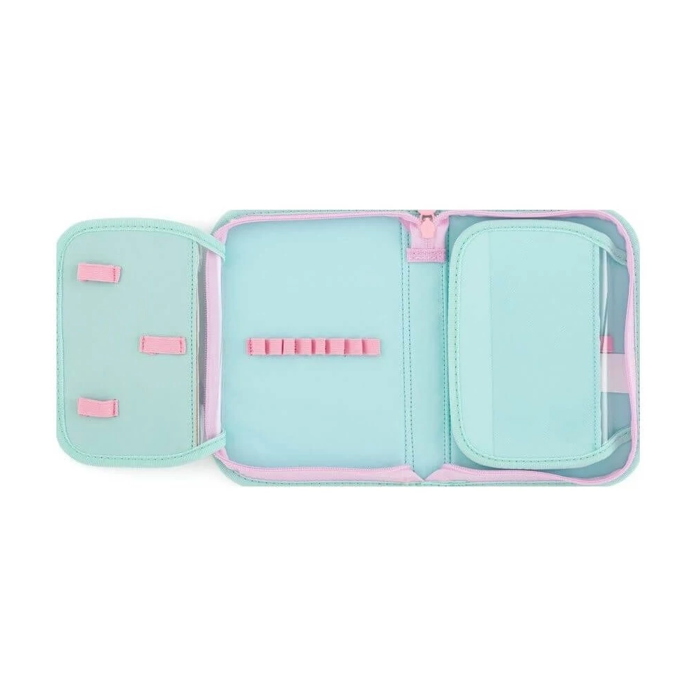 Kialakítása: két kihajtható klapnival rendelkezik, melyen kívül órarend és szorzótábla található. Kialakítása: 7+9+9 gumipánt ceruzáknak, 1-1 szélesebb gumipánt radírnak, hegyezőnek és vonalzónak. Bélése műanyag, így könnyen tisztítható.