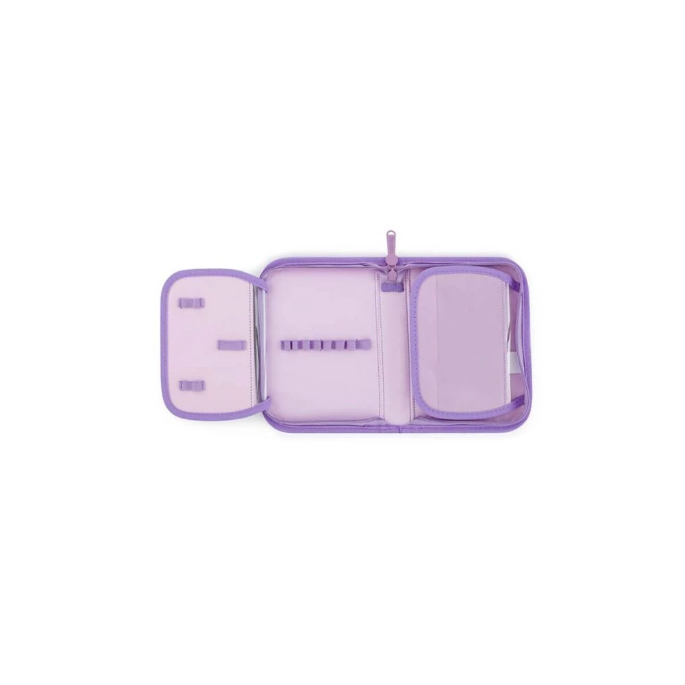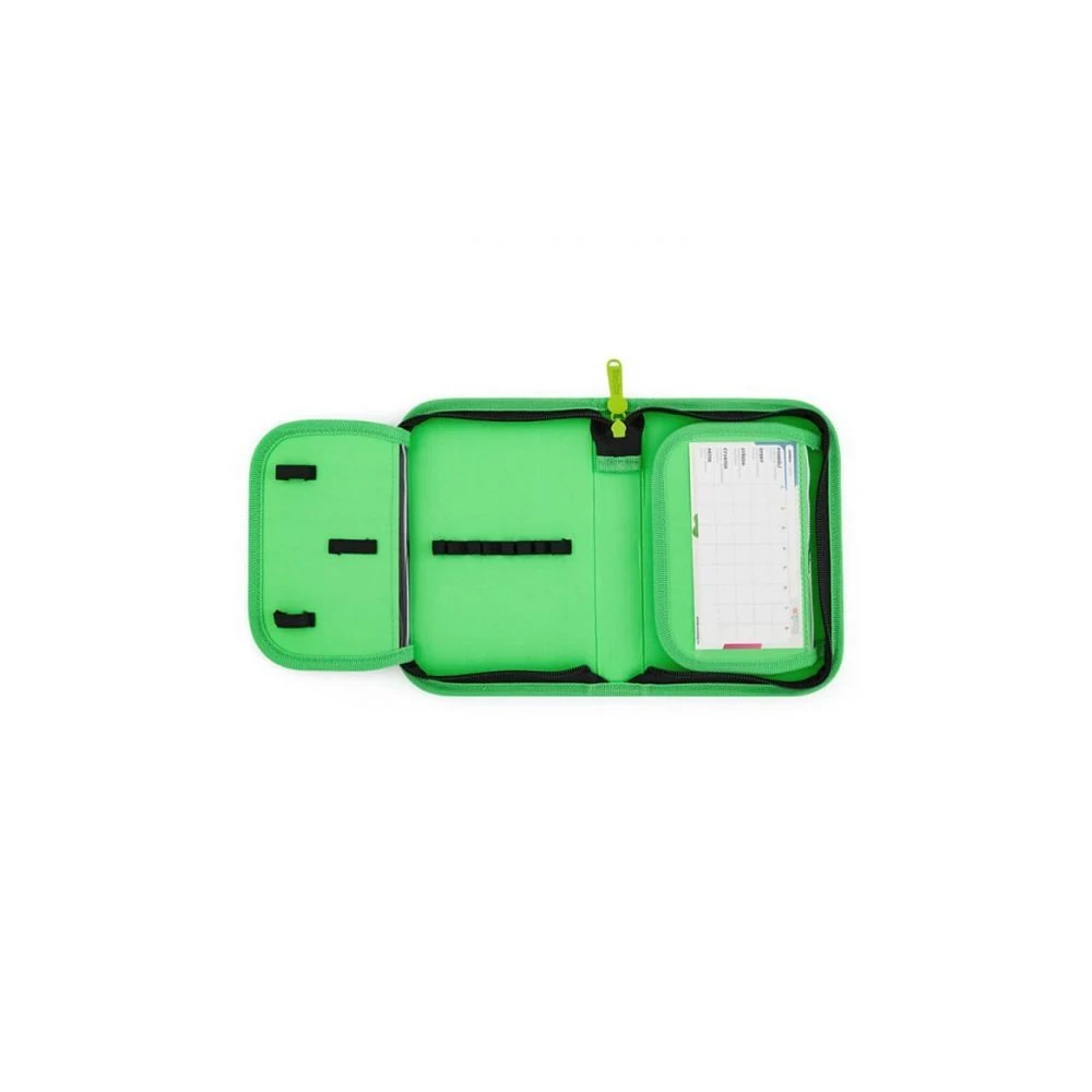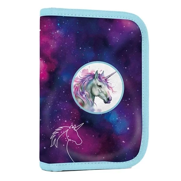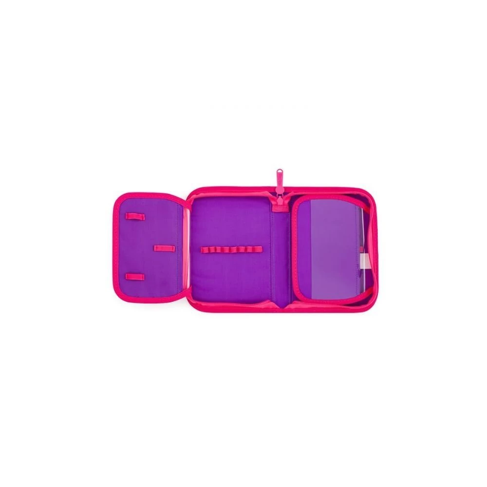 Kialakítása: két kihajtható klapnival rendelkezik, melyen kívül órarend és szorzótábla található. Kialakítása: 7+9+9 gumipánt ceruzáknak, 1-1 szélesebb gumipánt radírnak, hegyezőnek és vonalzónak. Bélése műanyag, így könnyen tisztítható.