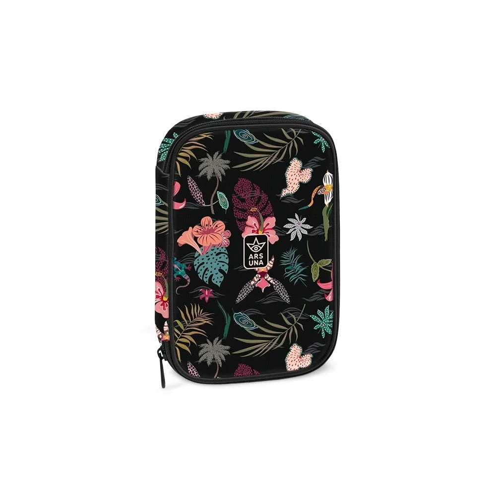 Többszintes, töltetlen, cipzáras tolltartó. Belül textillel bevont merev lapokkal, gumis kialakítással 30 ceruza számára az írószerek tárolásához és egy cipzáras belső zsebbel