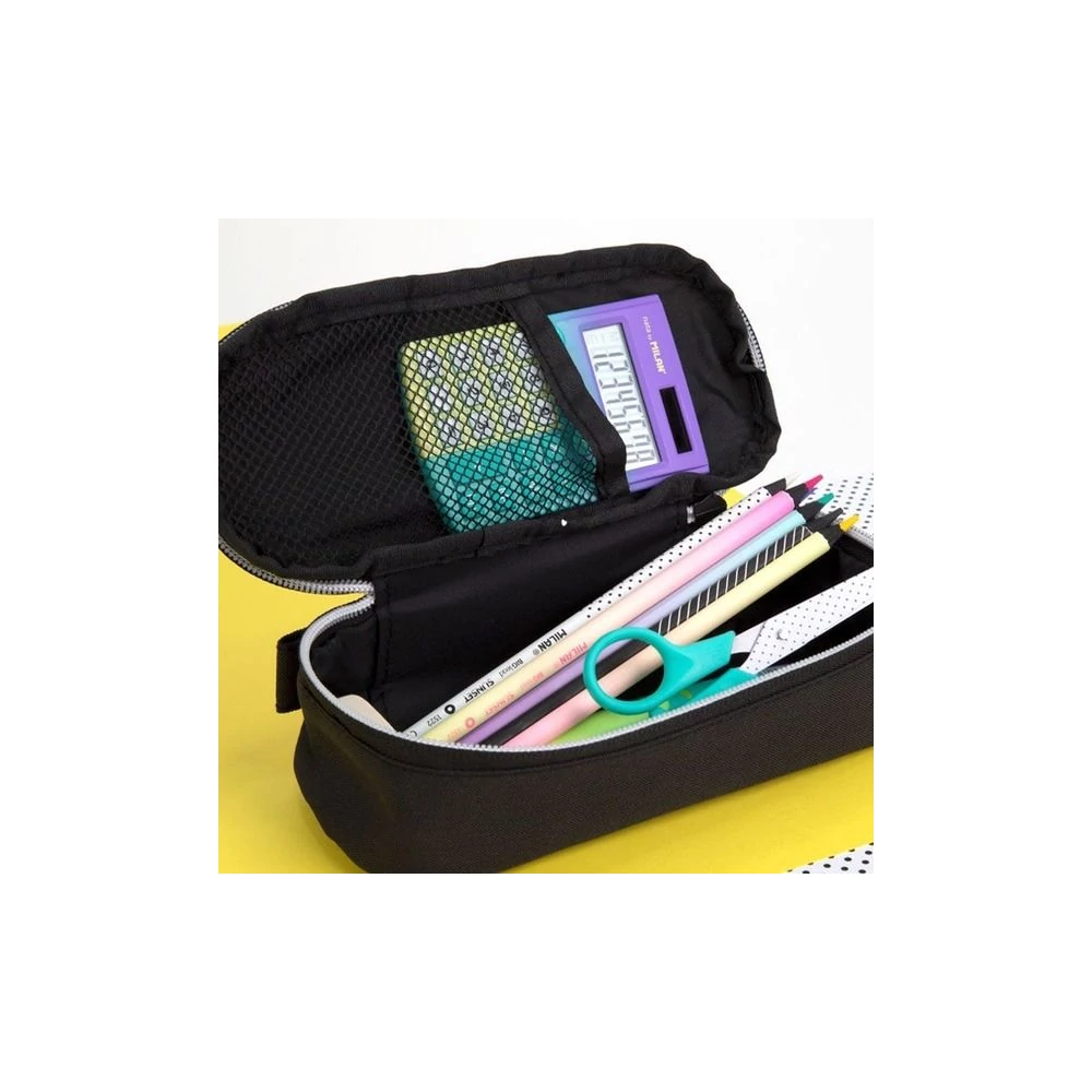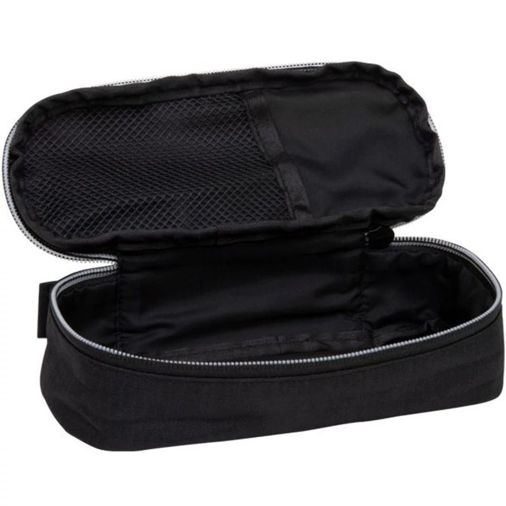 Ovális tolltartó belső hálós zsebbel.