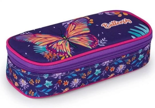 Szép pillangós mintájú szögletes cipzáras tolltartó belső cipzáras és nyitott zsebbel, középen füllel, melynek mindkét oldalán gumipántok találhatóak. A mélyített belső részbe ömleszthetőek az írószerek.
