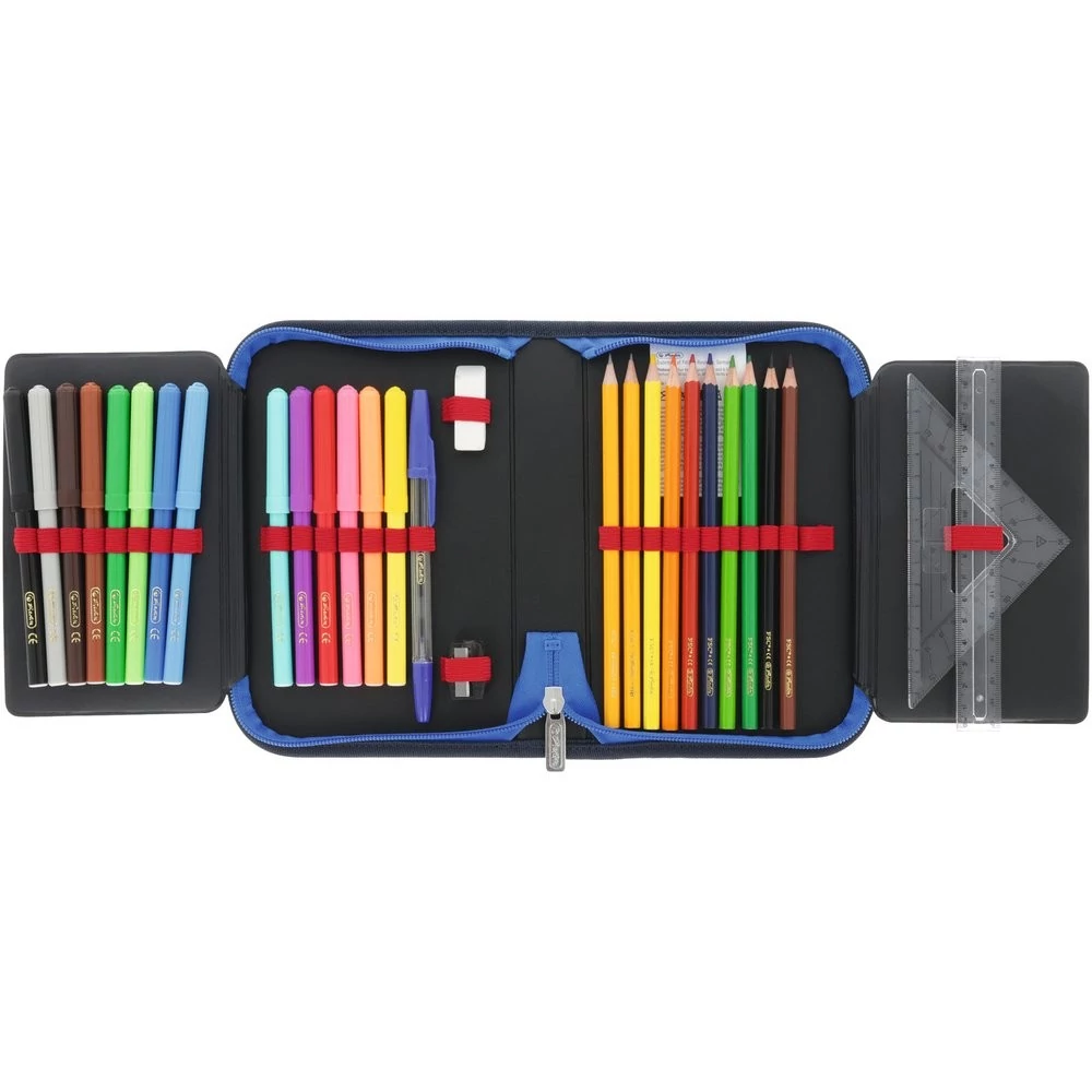 31 részes tolltartó 20,3x14x3,5 cm-es méretben, 2 klapnis. Tartalma: 14 db filctoll, 1 db golyóstoll, 1 db radír, 1 db ceruzahegyező, 2 db grafitceruza, 8 db színes ceruza, 1 db egyenes vonalzó, 1 db háromszög vonalzó, 1 db órarend, 1 db tolltartó. Anyaga: poliészter.