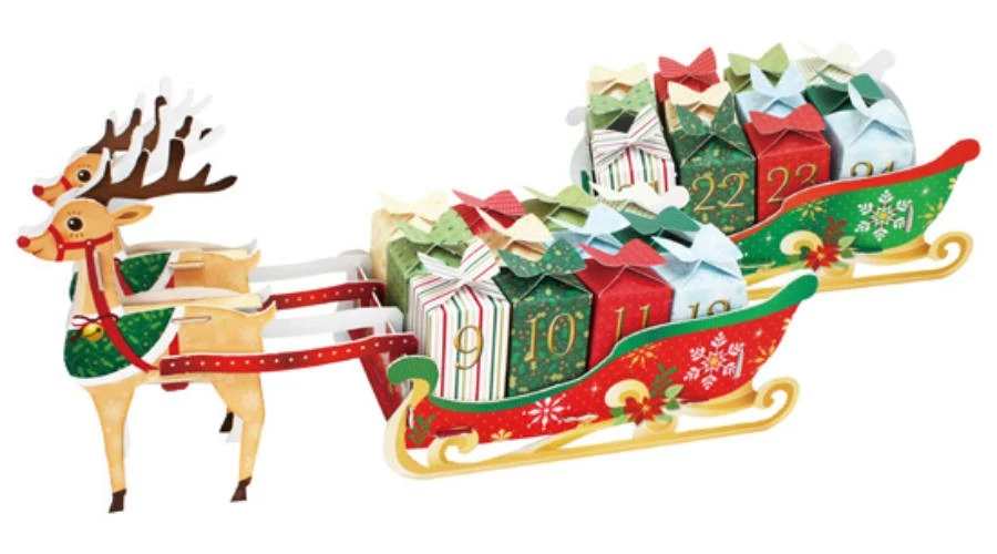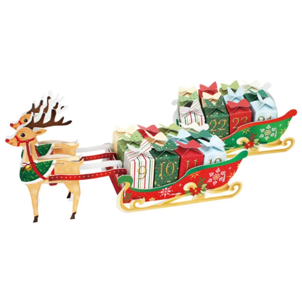 MINTÁK: SKA5156-rénszarvas, SKA5155-vonat - DIY adventi kalendárium 24db kis dobozkával. Nemcsak a dobozok nyitogatása és a bele rejtett apró meglepetések, de már maga a vonat / szán összeállítása is szórakoztató. Nem igényel ragasztást, vágást, csak az útmutatónak megfelelően egymásba kell illeszteni a darabokat. Gyorsan a lakás díszévé és az ünnepi hangulat megalapozójává válik. Mérete: 55x12x16 cm, kis doboz mérete: 5,3x3,4x3,4 cm.