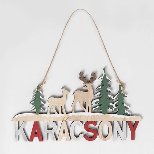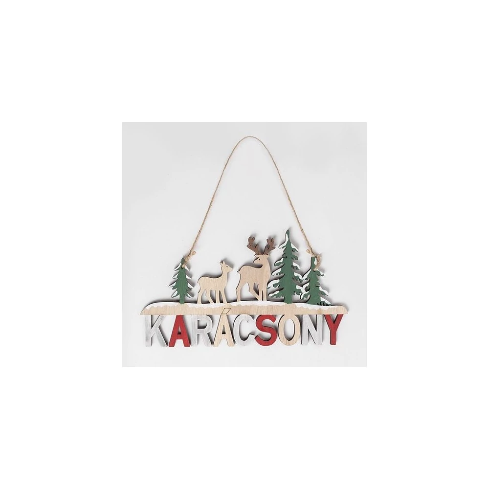 KAR. AJTÓDÍSZ fa fenyők, rénszarvasok, Karácsony felirattal 23 cm.