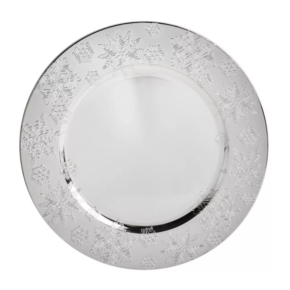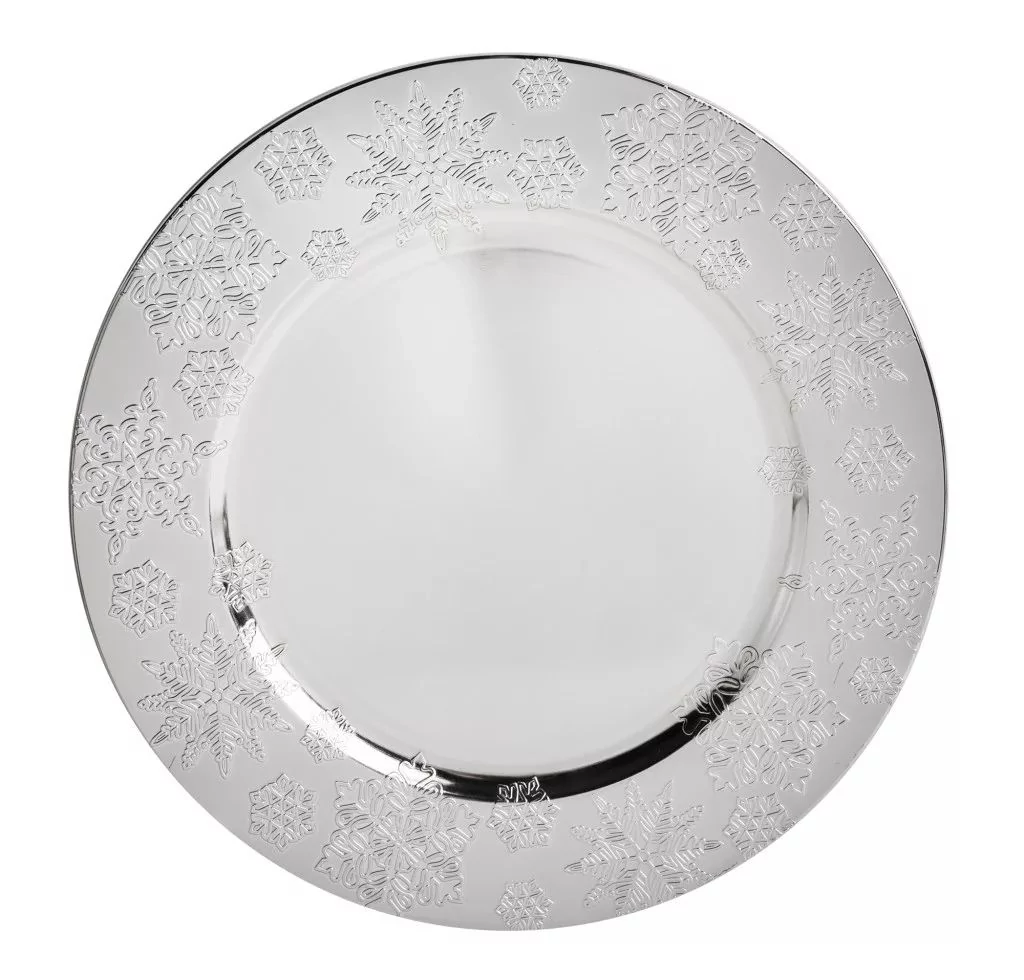KARÁCSONYI TÁLCA müa. kerek,ezüst hópihés, rose fagyöngyös 33cm