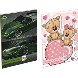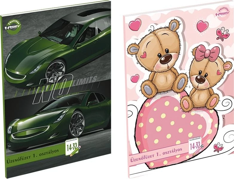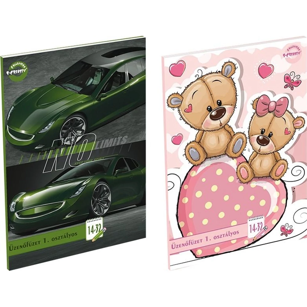 A5-ös méretű, 70g-os hófehér belív. 200 g-os műnyomó borító + fényes fólia. Gyerek grafikával és színvilággal díszített 14-32-es vonalazású üzenőfüzet 1. osztályosok számára.