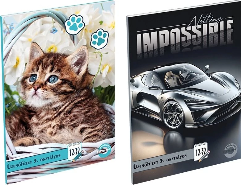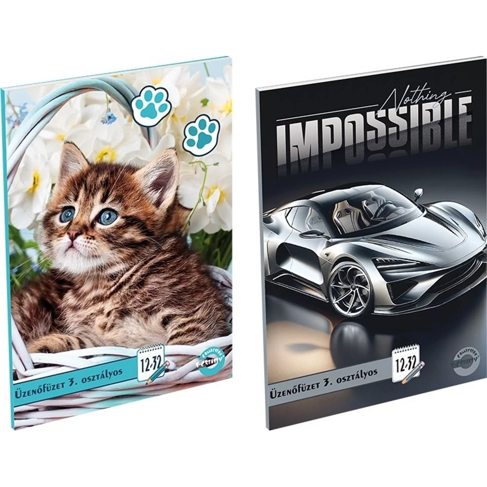 AA5-ös méretű, 70g-os hófehér belív. 200 g-os műnyomó borító + fényes fólia. Gyerek grafikával és színvilággal díszített 12-32-es vonalazású üzenőfüzet 3. osztályosok számára.