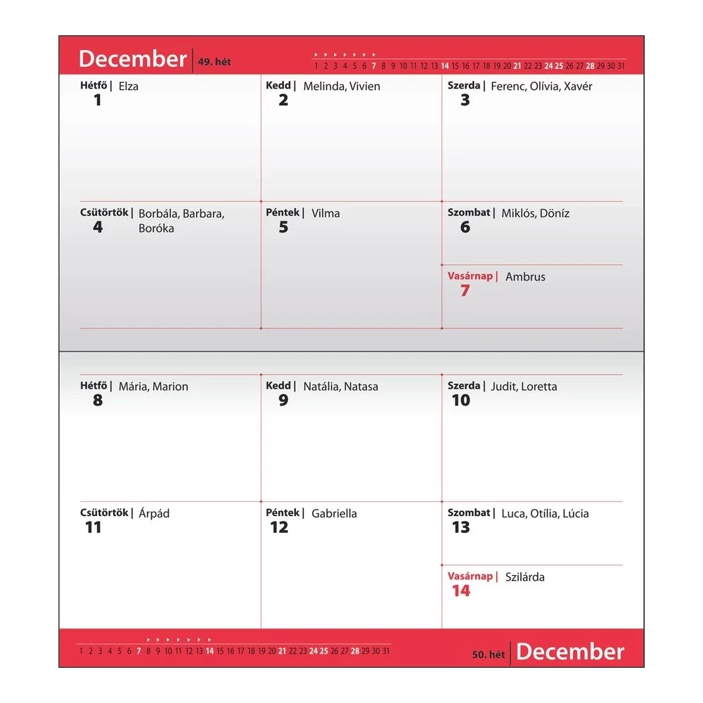 - Terjedelem:  64 oldal naptár (1 oldal 1 hét), külön névnap-listával.