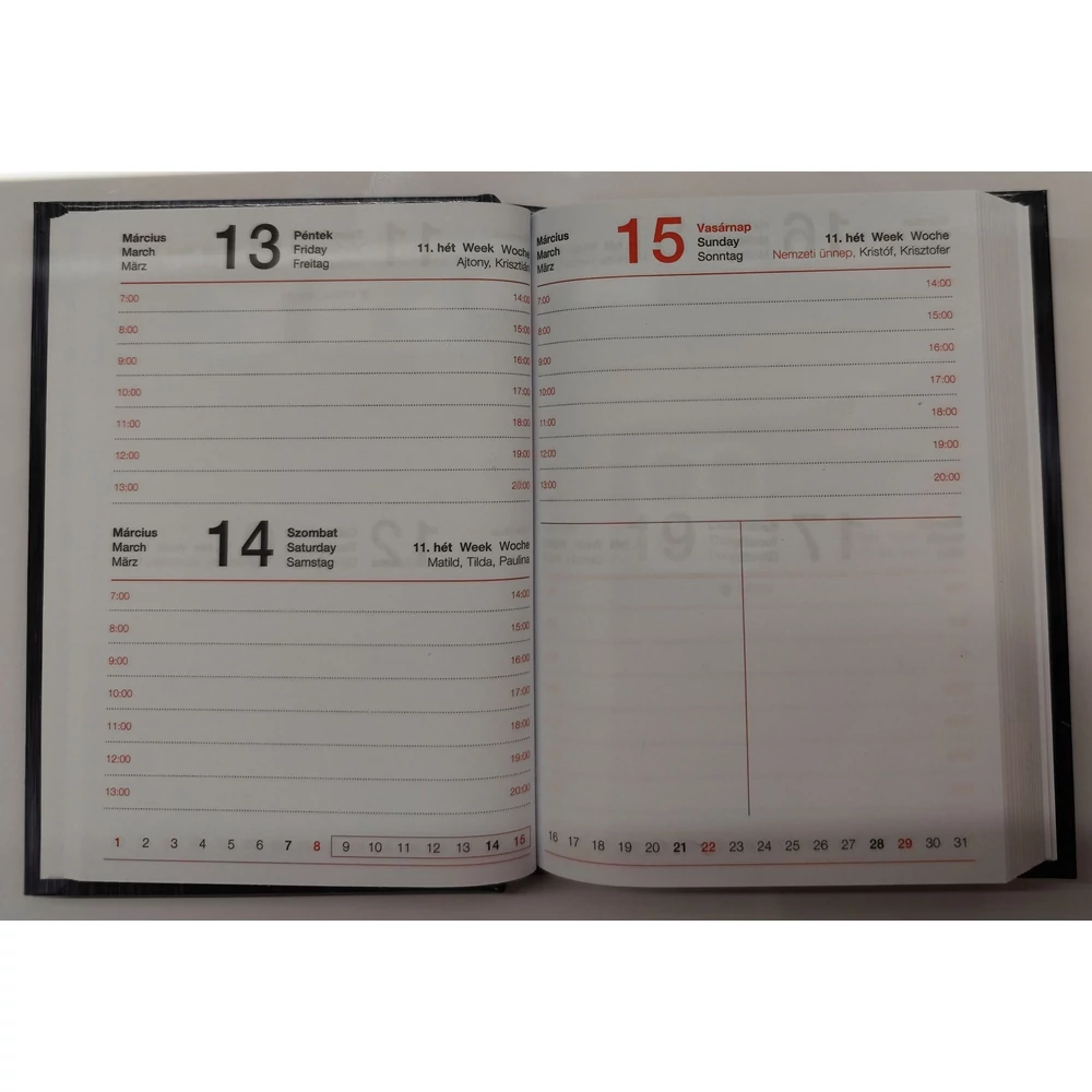 Méret 89x126 mm, 256 oldalas terjedelem. Beltartalom: adatlap, jegyzetek, összesítő naptár, éves tervező, telefonszámok. Naptárrész: 2 nap/oldalpár, magyar névnapok, holdfázisok, magyar/angol/német, magyar ünnepnapok, 7.00-20.00 órás beosztás. Ragasztott, cérnafűzött, 70 g-os ofszet belívek. Kemény tábla.