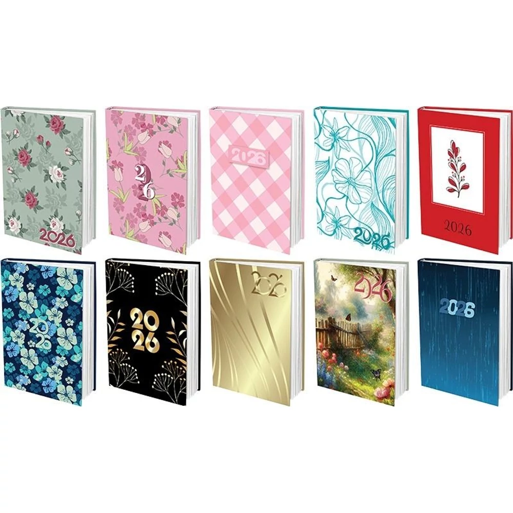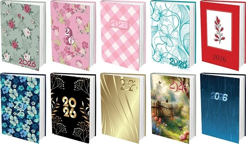 10 minta. 89x126 mm, 128 oldalas terjedelem. Beltartalom: adatlap, jegyzetek, összesítő naptár, éves tervező, telefonszámok. Naptárrész: 7 nap/oldalpár, magyar névnapok, holdfázisok, magyar/angol/német, magyar ünnepnapok, 6.00-21.00 órás beosztás. Ragasztott, cérnafűzött, 70 g-os ofszet belívek. Kemény tábla. Minta a készlet erejéig választható.