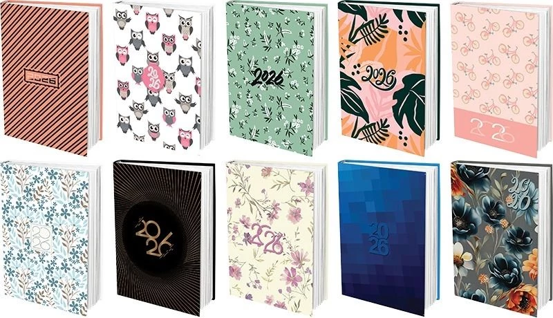 Méret 108 x 152 mm, 64+4 oldalas, heti naptárbeosztással. 90 g-os ofszet belív. Naptárrész: holdfázis, adatlap, névnap összesítő, magyar névnap és ünnepnap kiemelés, 2 oldal jegyzet. Ragasztott, 10 féle mintás borító, fényes fólia. Minta a készlet erejéig választható.