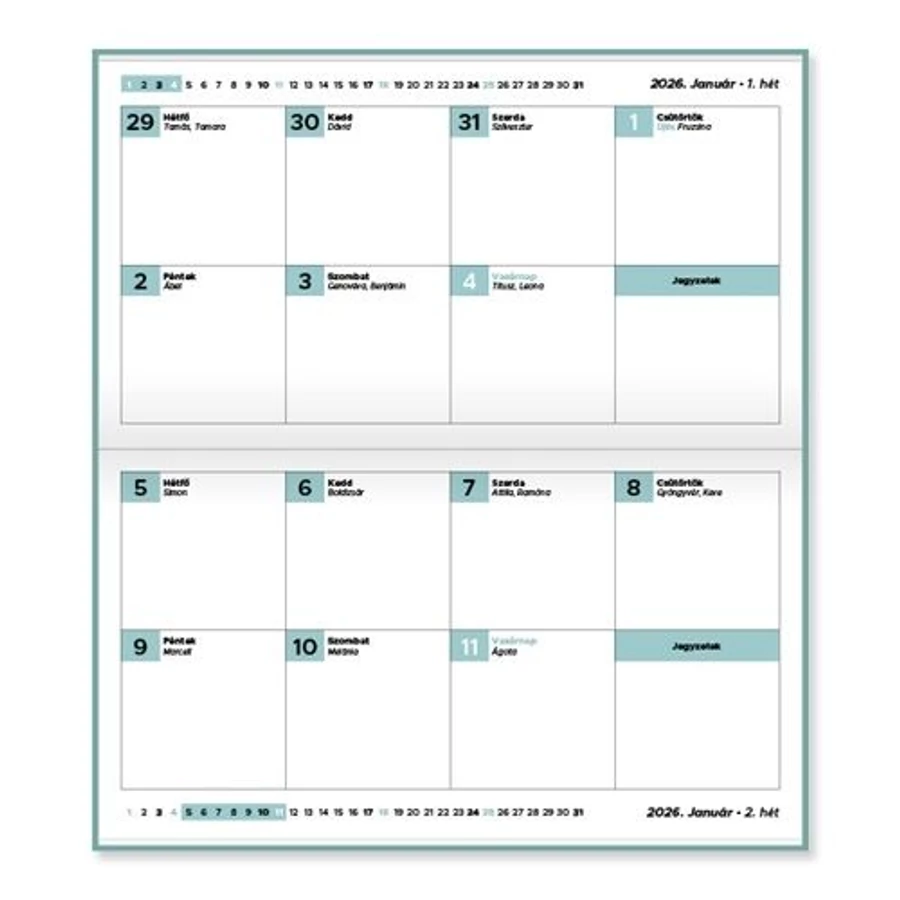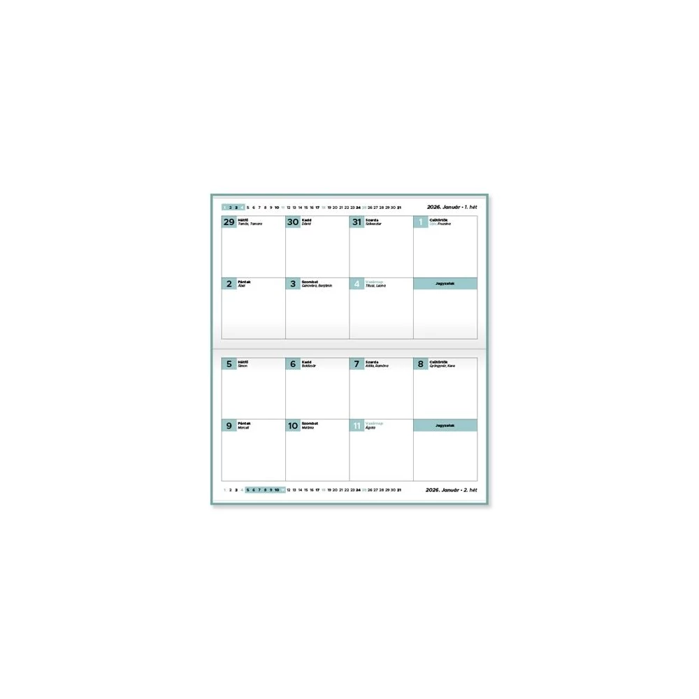 A Tűzött mini zsebnaptár fekvő kivitele ideális választás azoknak, akik szeretnének kis méretben is átlátható, kézre álló naptárat használni. A kétheti beosztás segíti a rövid távú tervezést, az irkafűzött kivitel és a színes papírborító pedig esztétikusan, mégis tartós formában teszi lehetővé a mindennapi használatot.
