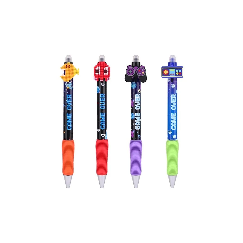 Zselés toll nyomógombbal. Speciális tintája a tollvéggel radírozható, de az írás -18 C alatt újra megjelenik. Írásvastagság 0,7 mm. Írásszín kék.